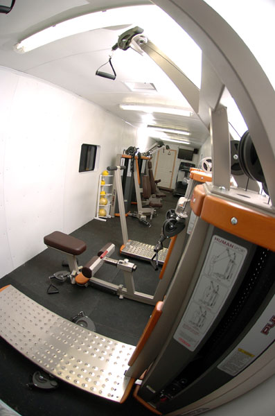 This is a mobile gym designed specifically for actors to work out in while they are working on set. Mobile gym with various training equipment and audio/visual equipment designed for optimum workout conditions.